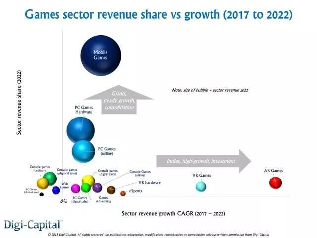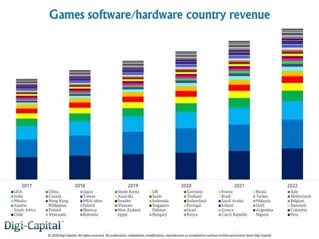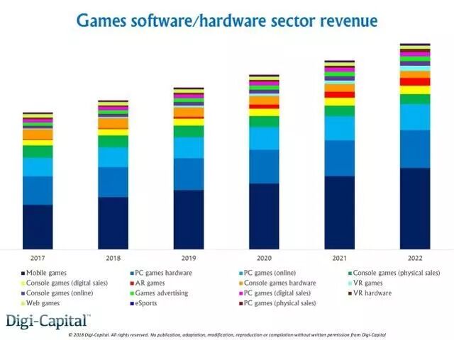 Digi-Capital在这份报告中提到,2022年前,手游软件、PC游戏硬件(包括用于游戏的PC、设备升级和各种外设等)以及PC在线游戏(包括可下载内容DLC、游戏内购IAP以及订阅服务等)合计创造的收入将在全球游戏业总收入中占据四分之三。如果手游软件继续保持近几年的强劲增长势头,今年将创造550亿至600亿美元的收入,到2022年收入将达900亿至950亿美元。2018年的PC游戏硬件销售收入将达300亿至350亿美元,并在2022年稳步增长至400亿至450亿美元区间。此外,PC在线游戏今年收入将达200至250亿美元,并在2022年前达250亿至300亿美元。