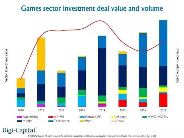 漂亮的增长数据也带来了连续两年的游戏业投资额增长,从硅谷沙山路(Sand Hill Road)到中国的风险投资机构在2017年为游戏初创企业投下了20亿美元,吸引投资额最多的领域包括游戏核心技术、手机游戏和AR/VR游戏等,电子竞技也激起了投资商的强烈兴趣,但吸引投资额不如上述三个类别。