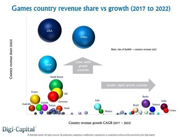 各国游戏市场收入的复合年增长率相差巨大,亚洲地区的市场规模和高增长率是整个行业增长的最大推动力。另外,收入增长率最高的国家主要来自东欧、拉丁美洲、中东以及非洲等起步基数较低的地区,而这些国家的游戏市场规模也无法在五年内挺进全球前十名。