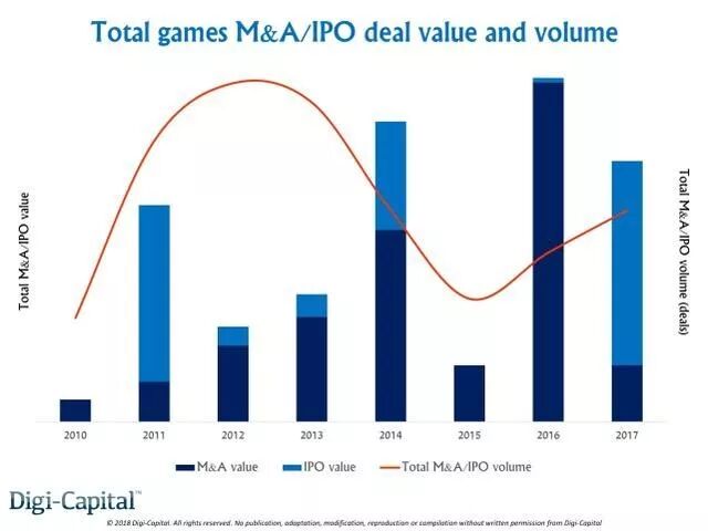 相比之下,由于没有较大规模的交易发生,2017年的游戏并收购额由2016年创纪录的280亿美元跌至50亿美元(2015年来的最低点)。不过在Netmarble,SEA(Garena)及Rovio的引领下,2017年启动IPO并成功上市的游戏公司数量创下历史新高。至于未来是否还会延续近十年游戏公司IPO“沉寂两年、爆发一年”的趋势,在接下来的12个月中或有定论。总的来说,尽管2017年游戏市场的并购交易和IPO涉及金额不高,但交易数量却相比往年却有显著增长。