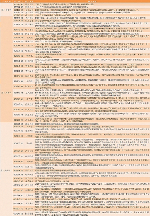 第三类上市公司由之前的新晨科技(300542.SZ)、卫士通(002268.SZ)、远光软件(002063.SZ)、广电运通(002152.SZ)、高伟达(300465.SZ)、赢时胜(300377.SZ)、御银股份(002177.SZ)、爱康科技(00610.SZ)以及新国都(300130.SZ)9家公司扩展至19家公司。不过这一类公司由于刚刚开始研究区块链技术,未来能否研究成功以及所需时间仍存在很大的不确定性。