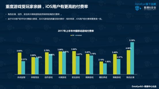 根据DataEye&S+的研究报告显示,2017年上半年中国移动游戏市场中,RPG游戏的整体付费率远远高于其他品类游戏。这个数据产生的时候正值“游戏印钞机”《王者荣耀》横行,中国游戏行业言必谈“MOBA”的时期。在那时,RPG是极少数能够在冲击之下仍然守住自己的市场高地的游戏类型。而之后的“吃鸡”不但没能攻入RPG游戏的市场,反而有一些RPG游戏凭借游戏类型的高可塑性,推出吃鸡模式对来势汹汹的“吃鸡”游戏“反将一军”,可见即使在如此现象级的爆款游戏的冲击下,RPG游戏仍然拥有着十分稳定的市场。