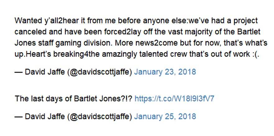 随后,Jaffe的团队与另一家发行商大成了合作协议,但不幸的是,发行商最近决定抽回资金,这才导致了此次大裁员。(美国时间)1月25日,David Jaffe还在Twitter发布了一条疑似工作室可能关门的消息,但目前他还没有正式对此表态。
