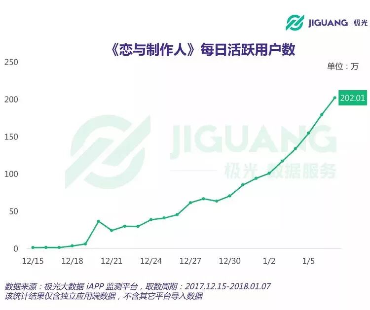 1月12日,市场研究机构极光大数据报告称,截至2018年1月7日,上线不足一个月的《恋与制作人》,安装数量已经达到711.13万,同时,《恋与制作人》每日活跃用户数同样保持高速增长,日活跃用户数已经达到202.01万。并且,《恋与制作人》的DAU增长曲线也和安装数量的增长曲线保持了惊人的一致。用户性别上,超94.2%为女性玩家,且一二线城市玩家占比很高。