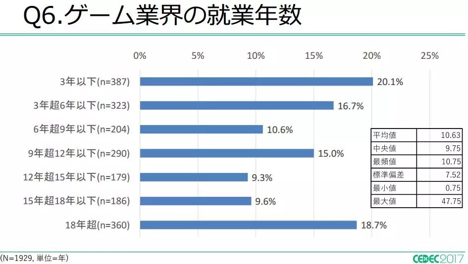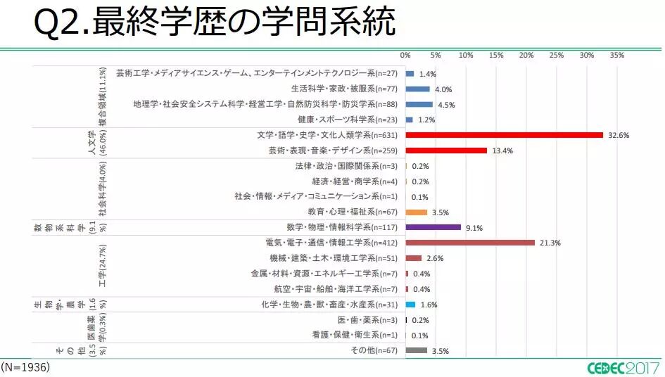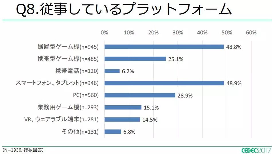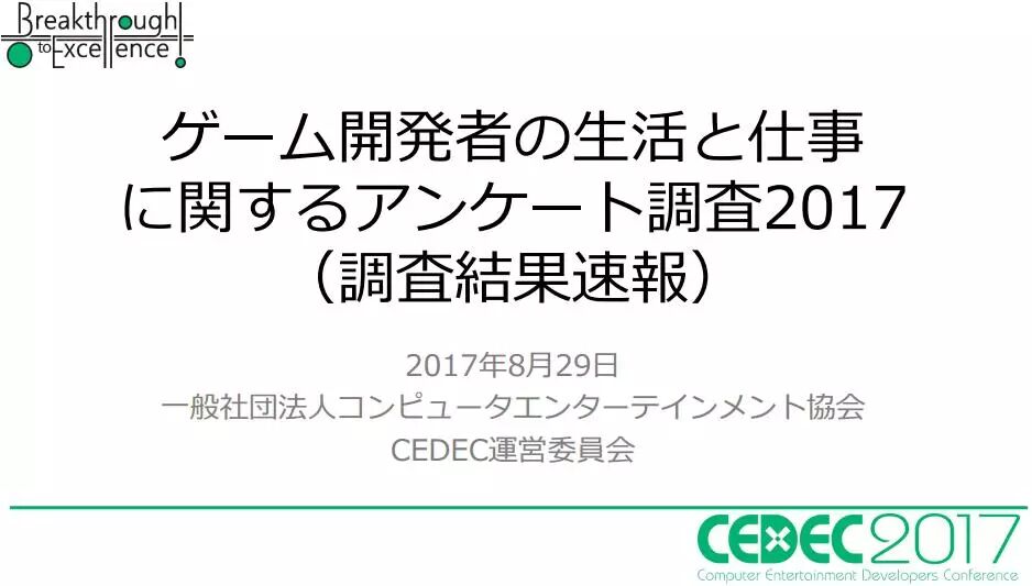 近日,日本CEDEC(Computer Entertainment Developers Conference,电脑娱乐开发者大会)公布了一份名为《2017年日本游戏开发者的生活与工作》的调查报告。该调查项目始于2012年,报告主要针对参与游戏开发的相关从业人员,包括游戏导演、游戏编辑、工程师以及设计师等等。今年的调查时间从2017年7月1日至7月31日。本次收到有效的调查结果共计1936条(2016年为1978条)。