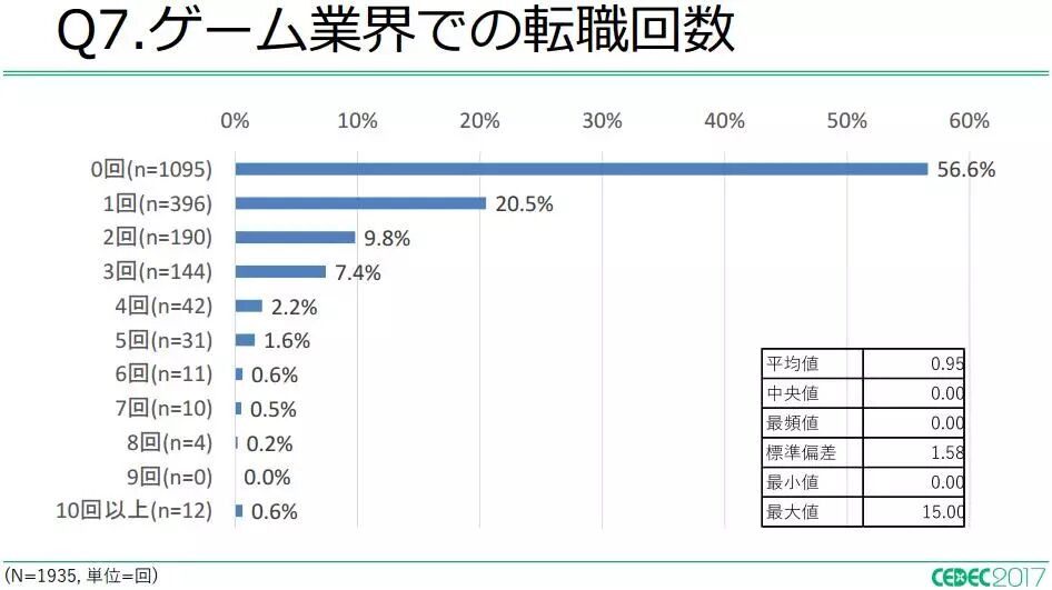 关于游戏开发者的工作年限,调查结果显示,跟历届调查差别不多,一般为十年左右。以区域划分来看,日本北海道平均工作年限达13.82年,九州为12.96年,也是远超10.63年的平均工作年限。而日本中部区域则为8.78年,在平均年限以下。另外,超过56.6%的游戏开发者没换过工作,就业年份越长,换工作的次数也相应增加。