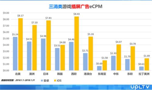 近日,专注于移动游戏广告变现的UPLTV (www.upltv.com)发布了2018年1月全球移动游戏广告变现数据报告。此报告基于iOS和安卓双端全球每日超过3000万次广告展示量的数据,分为休闲、三消、博彩三个游戏类型,统计了北美、拉美、西欧、东欧、日本、韩国、港澳台、东南亚、澳洲、中东10个典型地域的广告变现指标eCPM(广告千次展示的收益),为已经或者有志出海的国内游戏厂商提供了重要的数据参考。