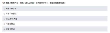最近,有玩家在社交媒体平台上反映受到了腾讯的调查问卷,问卷中主要针对育碧的《彩虹六号:围攻》进行一系列接受度调查。其中,问卷中出现了“如果《彩虹六号:围攻》进入国内(非Steam平台),您是否有意愿尝试?”的问题。