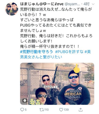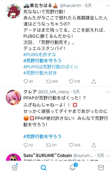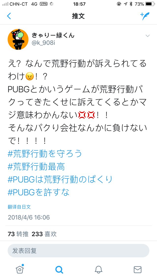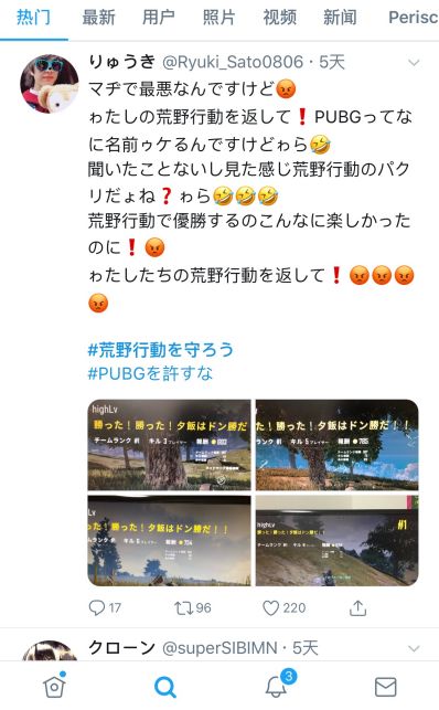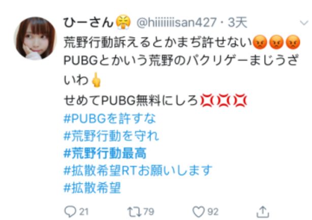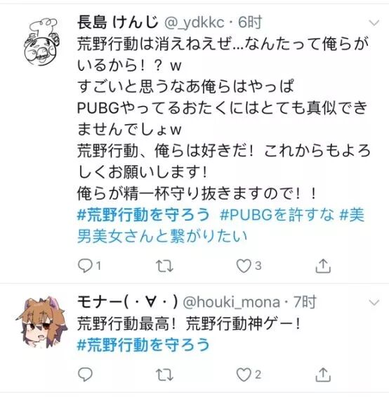 当这个消息传到日本之后,荒野民(日本《荒野行动》玩家的自称)们纷纷炸锅,跑到推特上表达自己的不满。而后又有玩家自发在推特上发起了#守护荒野行动的TAG,带动荒野民们向PUBG示威。