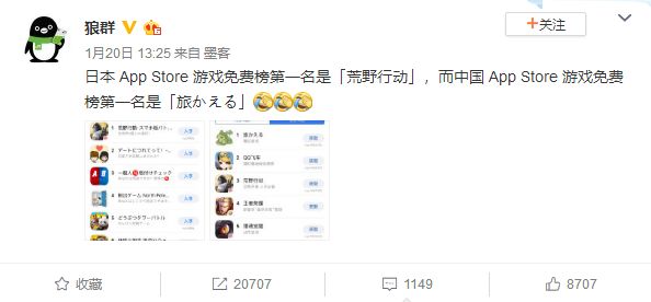 《荒野行动》在去年登陆日区之后,就受到了日本玩家的狂热追捧。在日本游戏《青蛙旅行》登顶App Store国区免费榜首时,作为国产游戏的《荒野行动》一直在占据着日区App Store免费榜的宝座,这样的现象被一度调侃为“中日友好的新桥梁”。