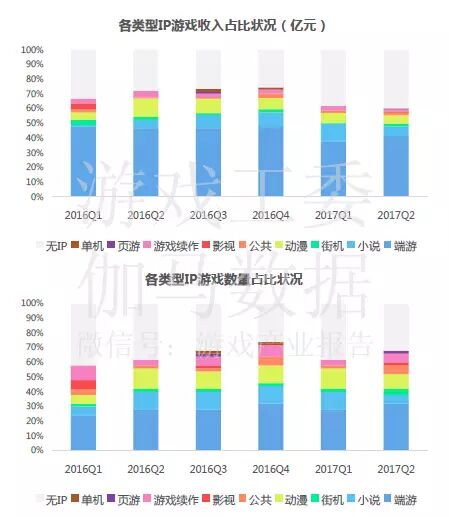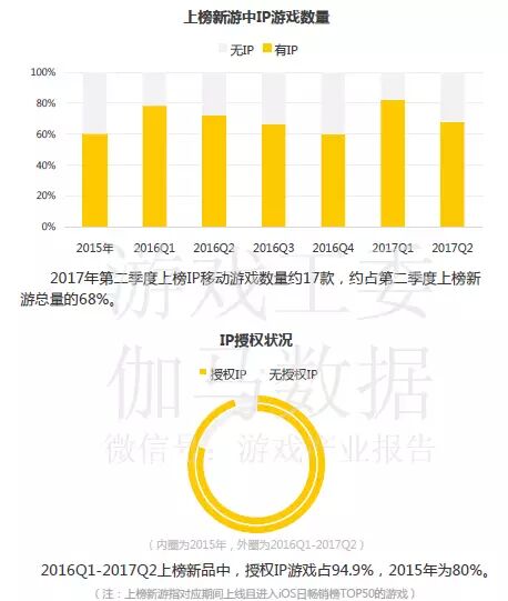 2016年第一季度至2017年第二季度,IP新游数量占上榜新游比例平均在七成以上,相比2015年增加约十个百分点。而在上榜新品中,授权IP游戏占到95%,国内市场对于IP授权愈来愈重视,但这一定程度上也提高了游戏研发成本。