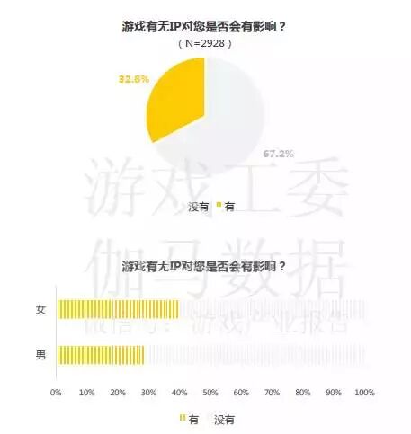 在调查中,32.8%的用户认为游戏有无IP会有影响。其中,四成受调查女性认为IP对自己选择游戏有影响,这一比例比男性高接近10%,这与女性用户更感性,更易受“情怀”等因素影响有关。