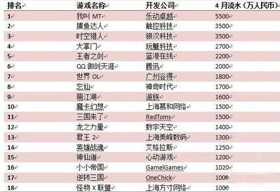 2013年4月份手游流水排名