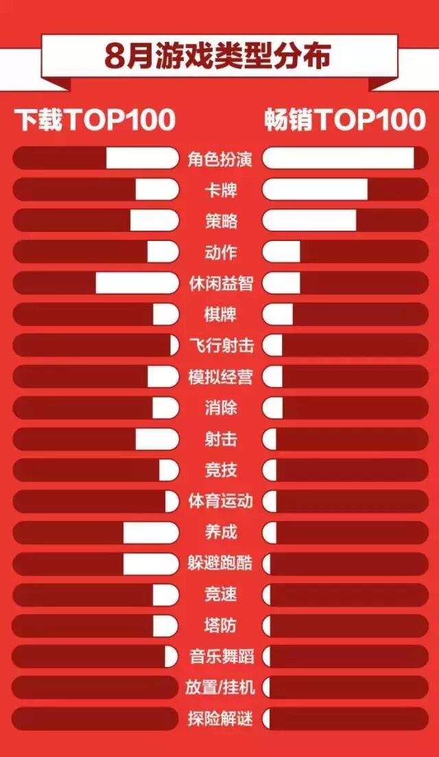 在8月畅销榜Top100游戏类型分布里面,位居前三的依旧是RPG(26%)、卡牌(18%)和SLG(16%),相较于之前的数据,这三种类型的占比基本波动不大,稳居最受玩家欢迎游戏的第一集团。动作、休闲益智和棋牌类游戏,组成了下载榜单上的第二集团,占比都超过了5%。除此之外,飞行射击、模拟经营、消除、养成、跑酷、塔防、音乐舞蹈、放置挂机等多种游戏类型割据一方,填补了各个细分市场的空缺,满足了玩家多元化的游戏需求。