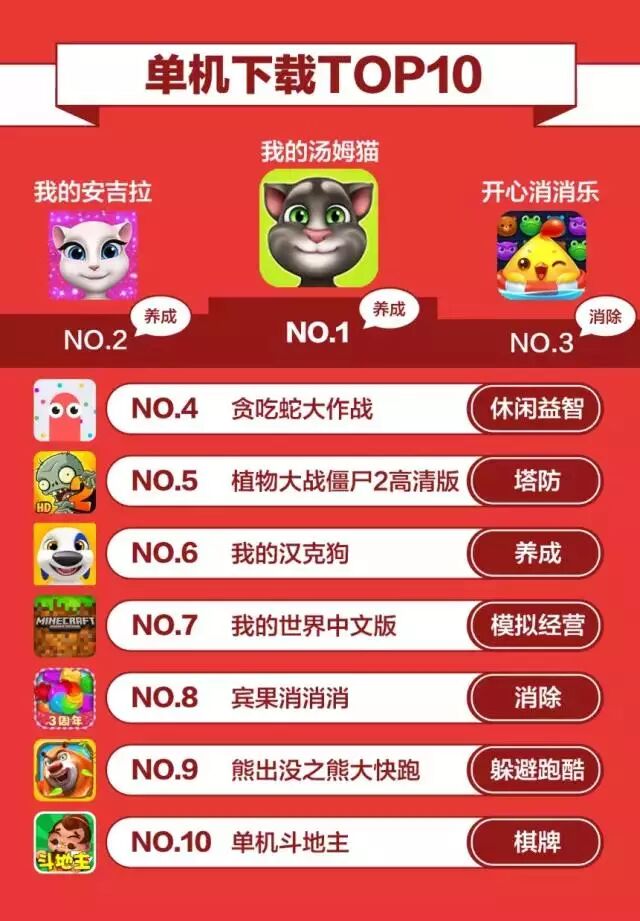 在单机下载榜方面,《我的汤姆猫》、《熊出没之熊大快跑》、《我的安吉拉》等老面孔仍旧保持在榜单之上。受暑期档学生放假的影响,养成类游戏成为了前十榜单中的大户,一举拿下了三个名额。《开心消消乐》和《宾果消消消》为消除类游戏保住了两个席位。其余的位置则是被塔防、休闲、跑酷、棋牌及模拟经营类的游戏所瓜分。唯一能够让人感受到惊喜的游戏,是由网易游戏代理的模拟经营类游戏《我的世界中文版》。这款沙盒游戏在未推出中文版时,就凭借高度自由的玩法赢得了无数好评,中文版一经推出,也就顺理成章的在8月份的下载榜中赢得了一席之地。