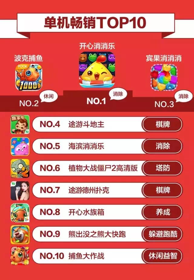 反观单机畅销榜,上榜产品基本都是老面孔,《开心消消乐》与《宾果消消消》依旧是消除类游戏的霸主。《波克捕鱼》作为休闲益智类的代表,也维持着自己TOP3的位置。与网游相类似,休闲、棋牌和消除类,在单机领域形成了“三国争霸”的局面。8月份榜单的其余位置,则被《植物大战僵尸2高清版》、《开心水族箱》、《熊出没之熊大快跑》、《捕鱼大作战》所瓜分。