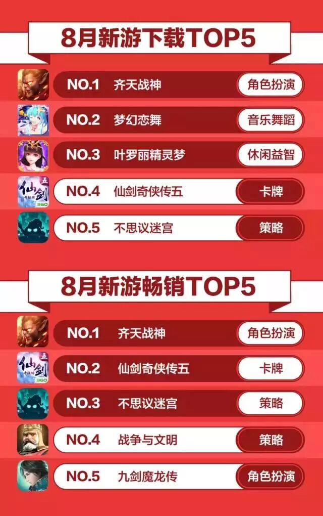 除了那些耳熟能详的“老朋友”,八月份同样有新的面孔出现。《齐天战神》作为8月上线的新品,凭借着全自由战斗和全交易等开放式玩法,一举杀入了网游畅销榜前十。《齐天战神》在上线前,在360游戏平台进行了长时间的预热和测试,积累了大量的人气,是游戏能够在暑期突围而出的重要原因。此外,《崩坏3》作为二次元游戏的代表作,也在8月吸引了青少年及学生党的青睐,新版本的推出和即将开始的周年祭活动,也让众多玩家爆“肝”不止。