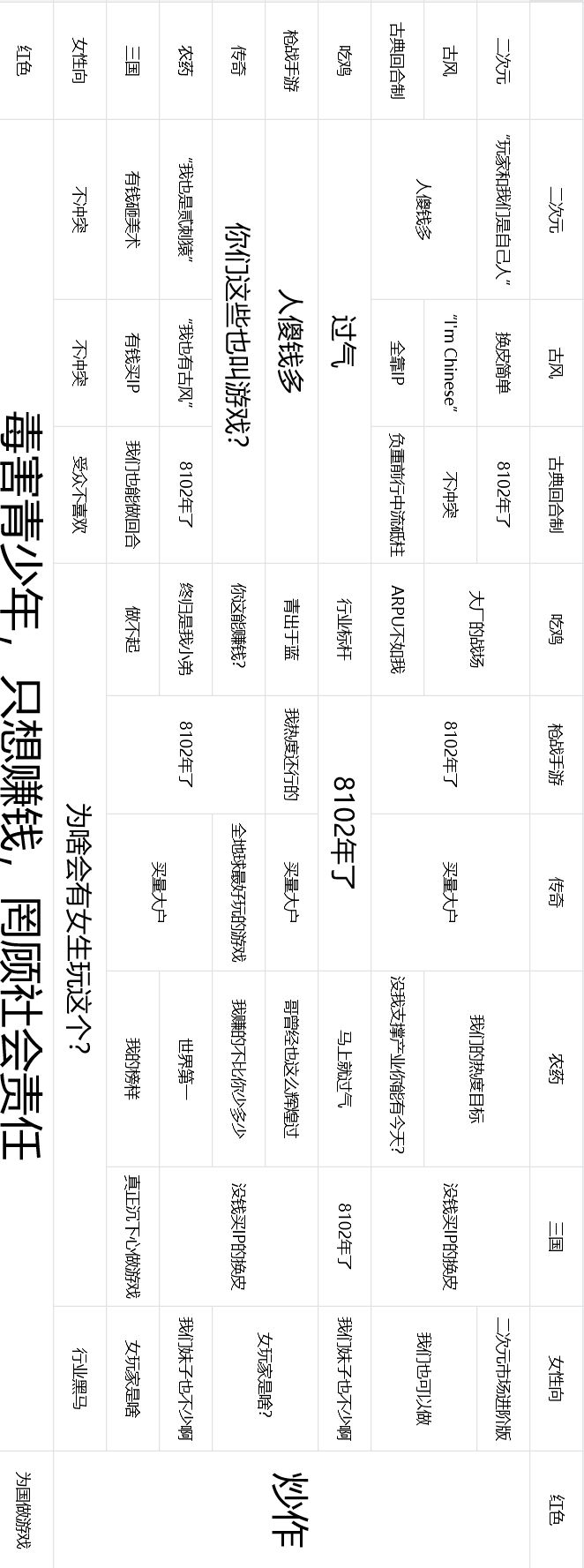 但是如果我们以一个调侃的心态来看这件事情的话,其实还挺能下饭的。目前存在的阵营图和鄙视链图都有点陈旧,特别是最近红色手游都要出现了,内容怎么还能是做端游的和做手游的互掐呢?