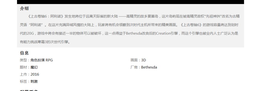 《上古卷轴6》的发布无疑是让人兴奋的,然而遗憾的是,Bethesda只是发布了一个三十多秒的宣传片来公布《上古卷轴6》,并表示游戏由本社开发,目前处于前期制作中,除此之外并没有给出其他任何有关游戏的有效信息。