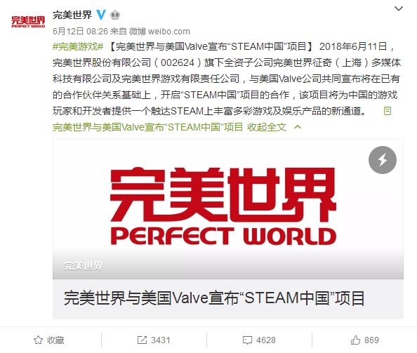 昨日,完美世界(002624)发布公告宣布其旗下全资子公司完美世界征奇(上海)多媒体科技有限公司及完美世界游戏有限责任公司在与美国Valve公司保持已有合作的基础上,开展“Steam中国”项目的合作。