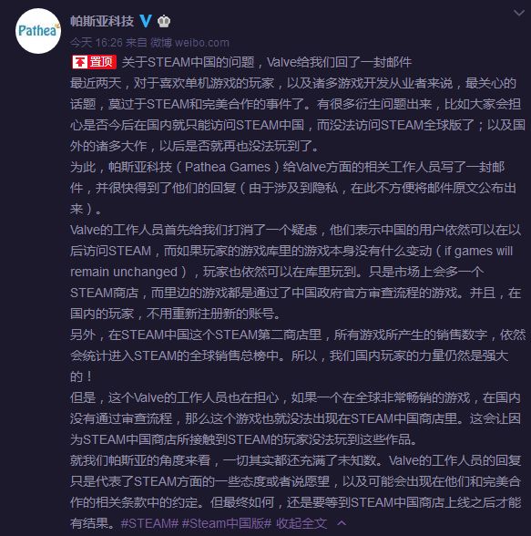 近日国产游戏《波西亚时光》的开发方帕斯亚科技以开发者的身份向Steam工作人员询问了关于Steam China的相关问题,并得到了回复。
