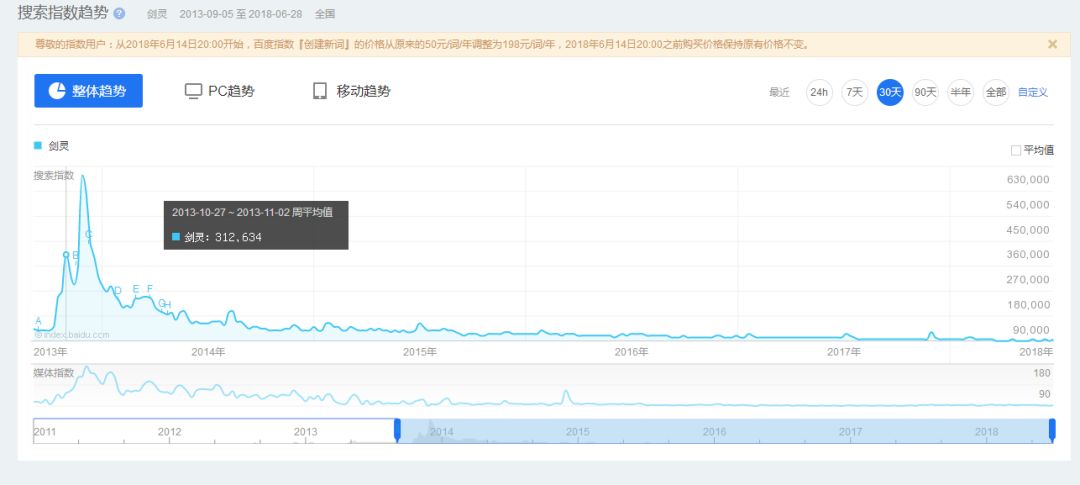 《剑灵》开测后的小峰值在2013年10月底,指数为332,634。