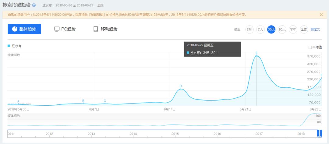 逆水寒峰值在6月22日,指数为345,304。