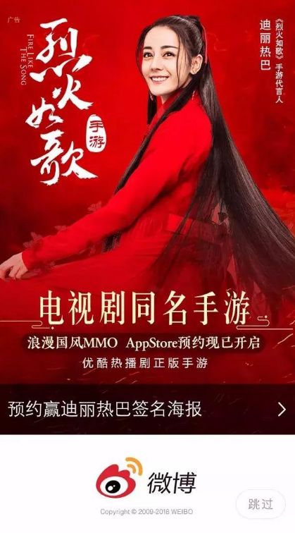 在新浪微博中,“大V+IP+明星粉丝动员”成为了有流量明星代言的IP手游的标配。作为此类型游戏代表的《烈火如歌》在微博上的影响更不例外。除了围绕“迪丽热巴”这一代言人展开营销之外,还投放了微博开屏广告。据微博CEO王高飞透露,微博开屏广告价格已过百万,并且是仅限千万级框架用户的专属资源。(ID:eplay520)