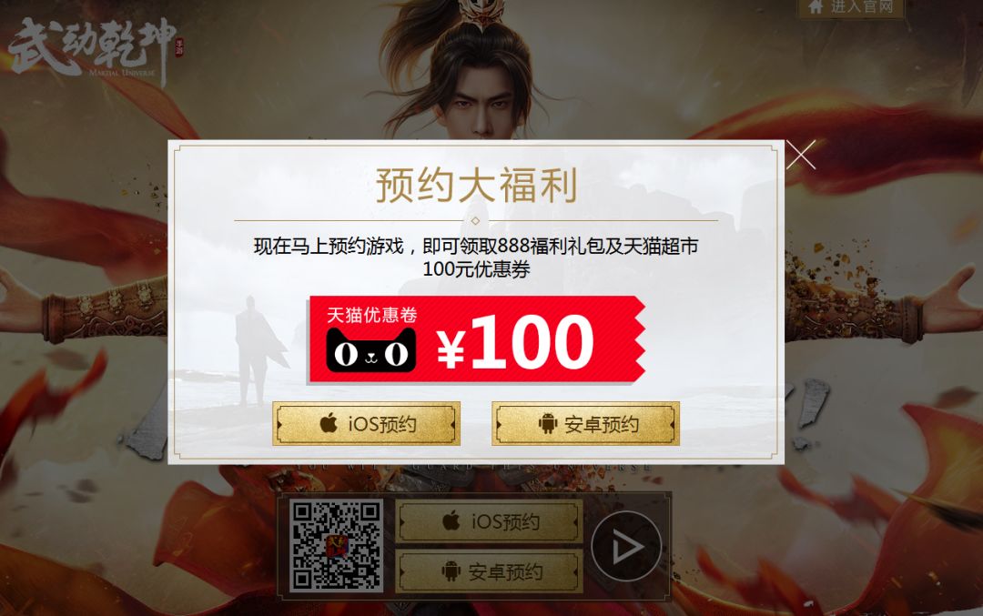 此外,阿里游戏也发挥了“生态优势”,在其手游《武动乾坤》的官方页面,打开后就会蹦出“天猫优惠券”的弹窗(而且这个所谓的优惠券也只是天猫的一个“满199-100”的商品聚合页面),“阿里”本身的品牌存在感非常高。