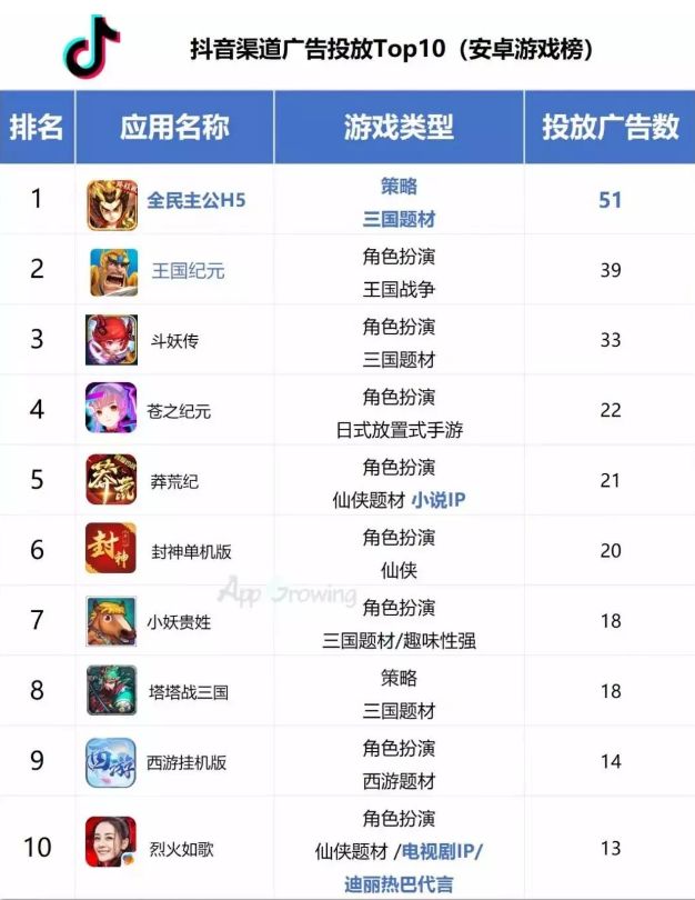 此外,《烈火如歌》也在抖音等短视频渠道进行了大量的广告投放。根据App Growing5月20日发布的《抖音广告分析报告》显示,《烈火如歌》在抖音的投放广告数位列第十。