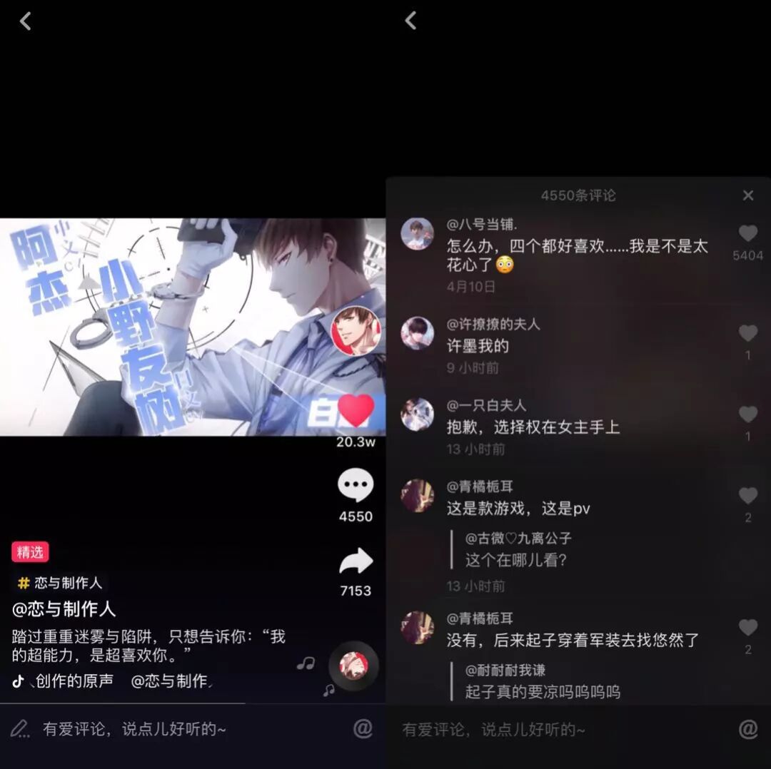 乙女向游戏《恋与制作人》的抖音蓝V有17.3万粉丝,截至目前发布了两支视频,却收获了51w赞,可见其游戏在抖音上的热度。