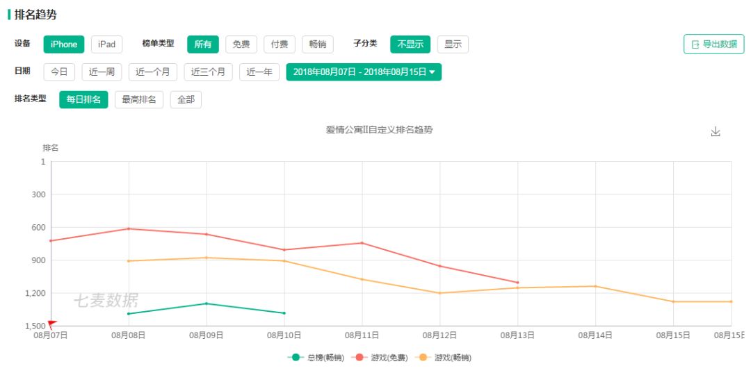 七麦数据的查询结果显示,《爱情公寓》手游版上线后的表现并不乐观。在iOS平台,游戏免费榜一直没能突破600,畅销榜更是在勉强挤到前900名之后迅速滑落到千名开外。