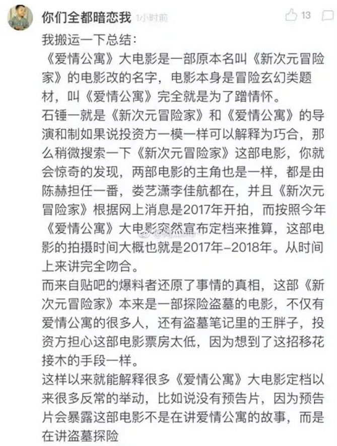 随后网友爆料,《爱情公寓》电影原名为《新次元冒险家》,本来就是一部探险盗墓的电影。但投资方可能对电影票房的信心不足,才将《爱情公寓》的IP套到了电影上,完成了一次“换皮”。