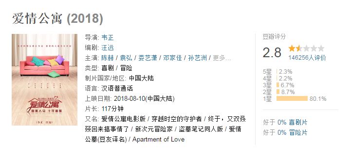 截止发稿,豆瓣评分仅为2.8,有80.1%的网友给出了一星。