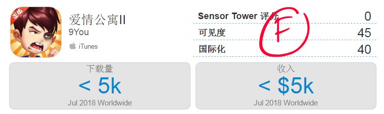 数据平台Sensor Tower给这款手游打出了“F”的评级,且从该平台给出的推算数据来看,这款手游在iOS平台的下载量应该不足5000。