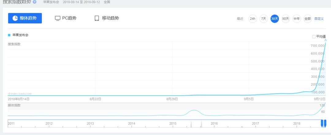 百度指数显示,今年苹果发布会的搜索指数峰值达到了70万,而这意味着今年的苹果发布会的关注度高于大多数时间的《延禧攻略》。