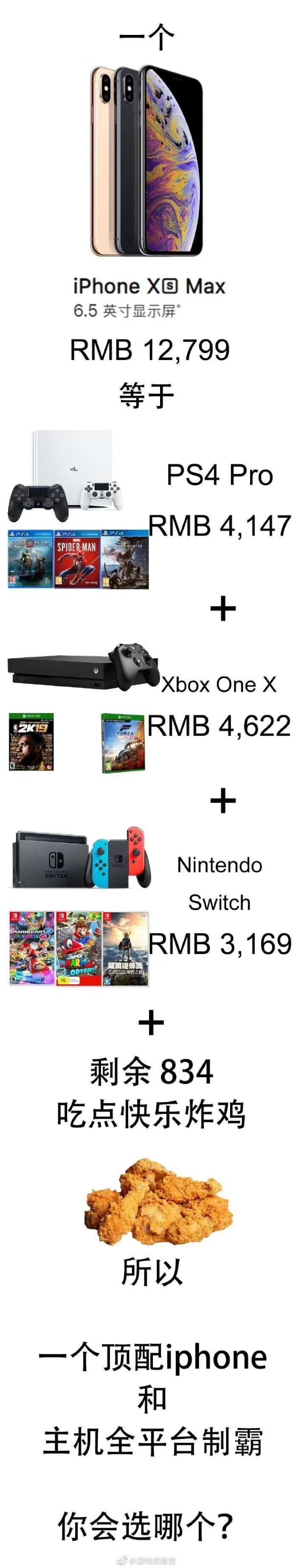 博主@游戏观察君发图,一款顶配iPhone的价格居然能够全主机平台游戏制霸,还留下一堆钱来买“肥宅快乐炸鸡”。