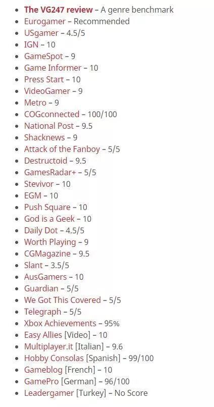 很多媒体直接对该作给出了满分。其中,IGN在打出10分满分后,还发出了“明天上什么班!玩爆”的感叹。