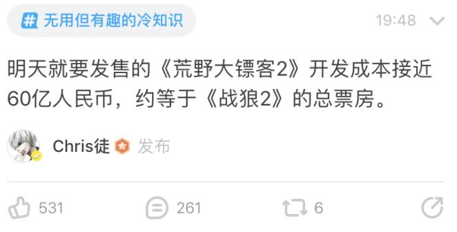 “明天就要发售的《荒野大镖客2》开发成本接近60亿人民币,约的等于《战狼2》的总票房。”
