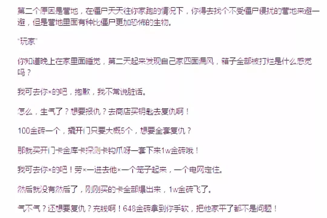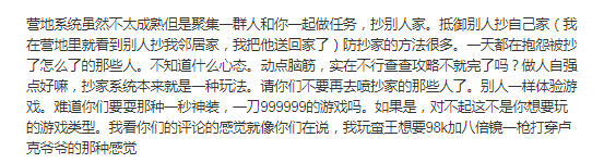 但也有玩家给出了较高的评价,认为这是目前流行的生存游戏核心卖点之一,《明日之后》则对该模式进行了一定优化,更适合大众玩家习惯。