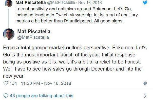 据媒体报道,《宝可梦 Let’Go》(双版本合计)日本首周(发售前三天)的实体版销量为664198份。而在英国,《宝可梦Let’Go》则拿下了上周的英国实体零售最畅销游戏的宝座。NPD分析师Mat Piscatella近日发布了推文,表示他非常看好这款游戏,并指出游戏的表现将会超出预期,将会是“本年度最重大的游戏首发”。