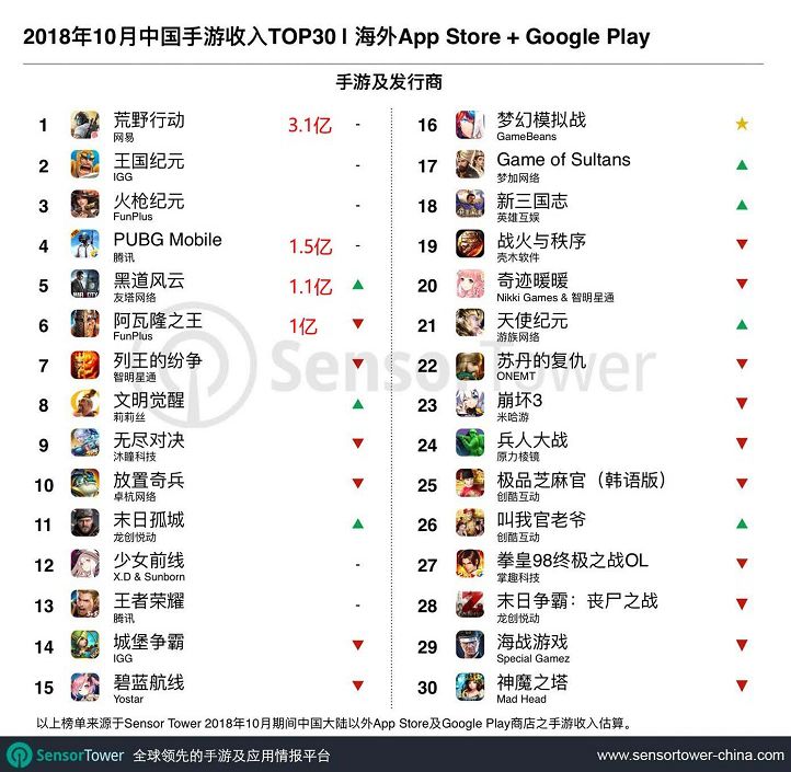 近日市场研究机构Sensor Tower近日发布了2018年10月份的中国手游海外收入TOP30榜单。与上个月相比,SLG手游的表现更加强劲,收入前十名中SLG手游的数量达到六款,莉莉丝SLG新作《文明觉醒》和友塔网络的《黑道风云》成为了TOP10中SLG手游俱乐部的新会员。