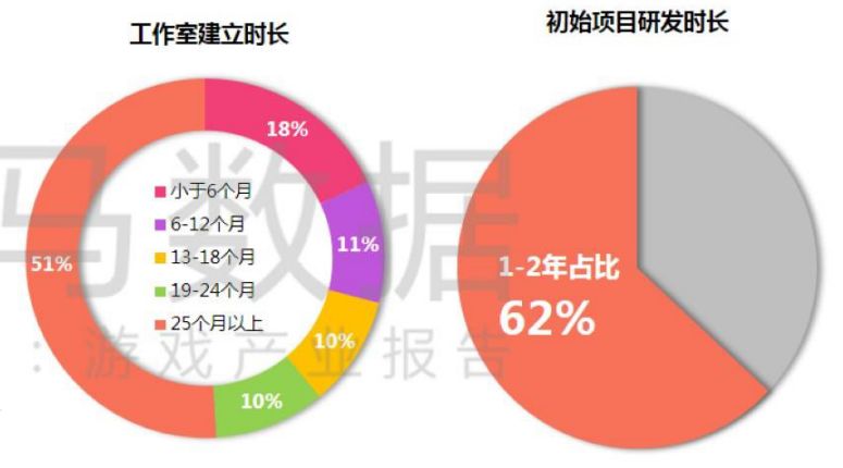 根据今年伽马数据发布的《独立游戏发展状况报告》,超半数工作室仅有2-5人组成,很多工作室尚未研发出成品,独立游戏工作室状况方面,有59%的工作室仅有2-5人组成,49%的工作室建立时长低于两年,同时,根据调查结果显示,6成以上的团队初始项目研发时间长达1至2年。这种长周期的消耗对独立游戏工作室的生存构成很大威胁。
