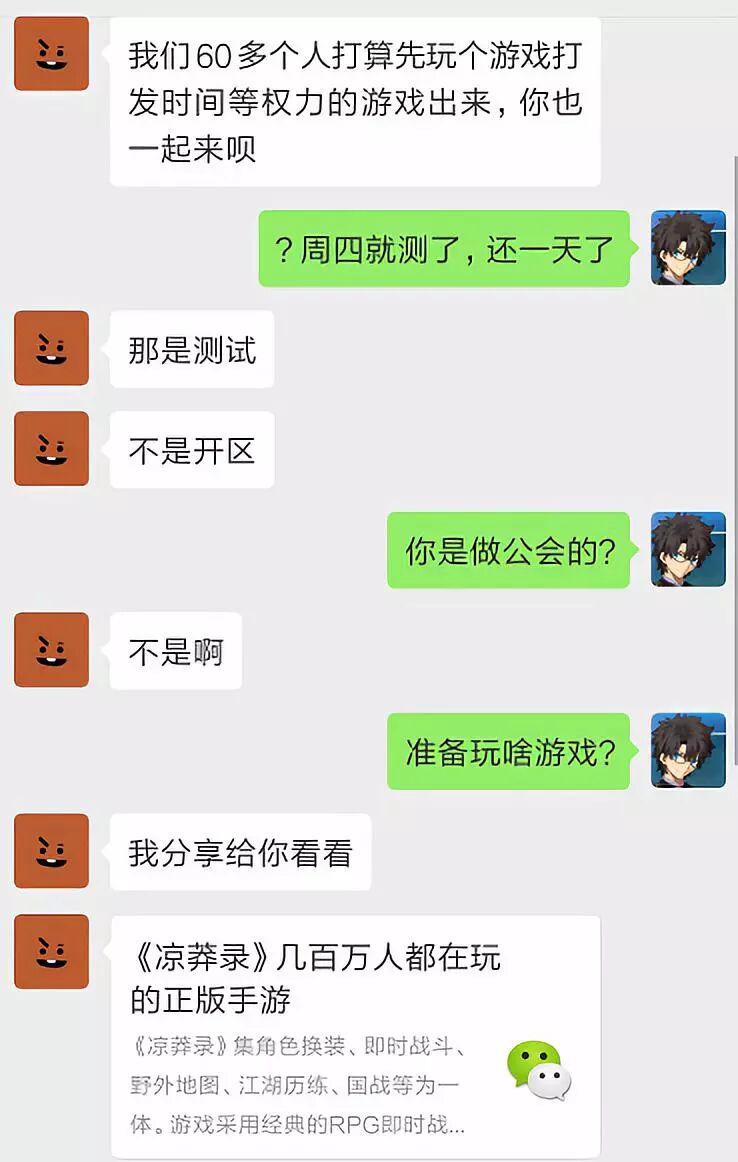 伴随着买量和IP成本进一步水涨船高,不少游戏与公会合作,打起了去其他游戏“挖人”的主意。以往,一些战斗力很高的玩家容易成为目标,收到一些“妹子”发来的好友申请,几番寒暄过后交换联系方式,然后几经辗转抛出最终主题“小哥哥,我们去玩其他游戏吧。”