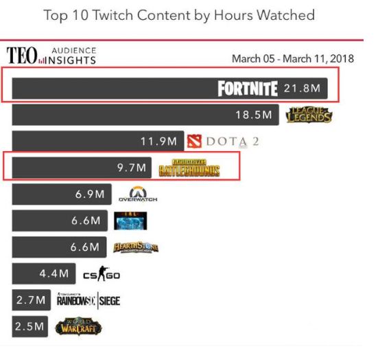 在国外,《绝地求生》面临的最大挑战对手是《堡垒之夜》。2018年,《堡垒之夜》拿下了Twitch游戏观看时长冠军,而《绝地求生》仅排到了第五名。
