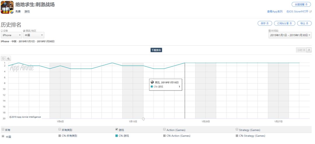 本月,随着《绝地求生:刺激战场》新活动的开启,原本一直处于AppStore下载榜头部的《绝地求生:刺激战场》于1月18日再次登上下载榜冠军,并保持至今。