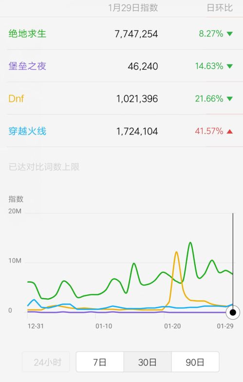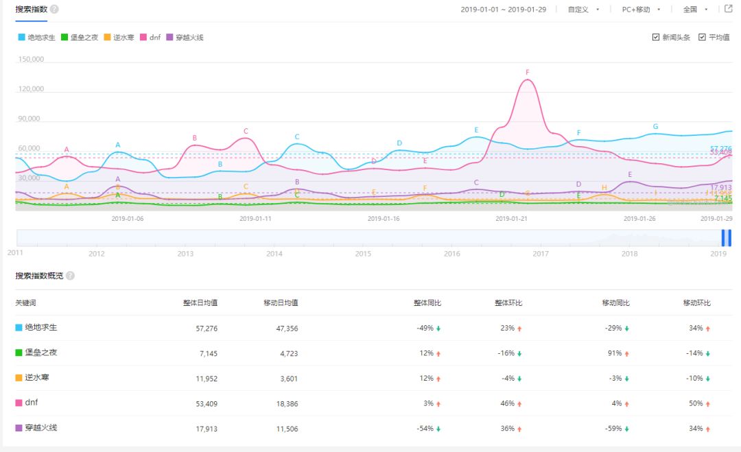 通过百度搜索指数的游戏名称舆情词对比得出的数据图显示,《绝地求生》的搜索指数在2019年1月份,除少部分时间被《DNF》超过外,几乎稳居这些热门游戏中的第一名。相比起中国热门的端游数据而言,《绝地求生》在海外最大的对手《堡垒之夜》,在中国大陆完全没有对《绝地求生》构成威胁。