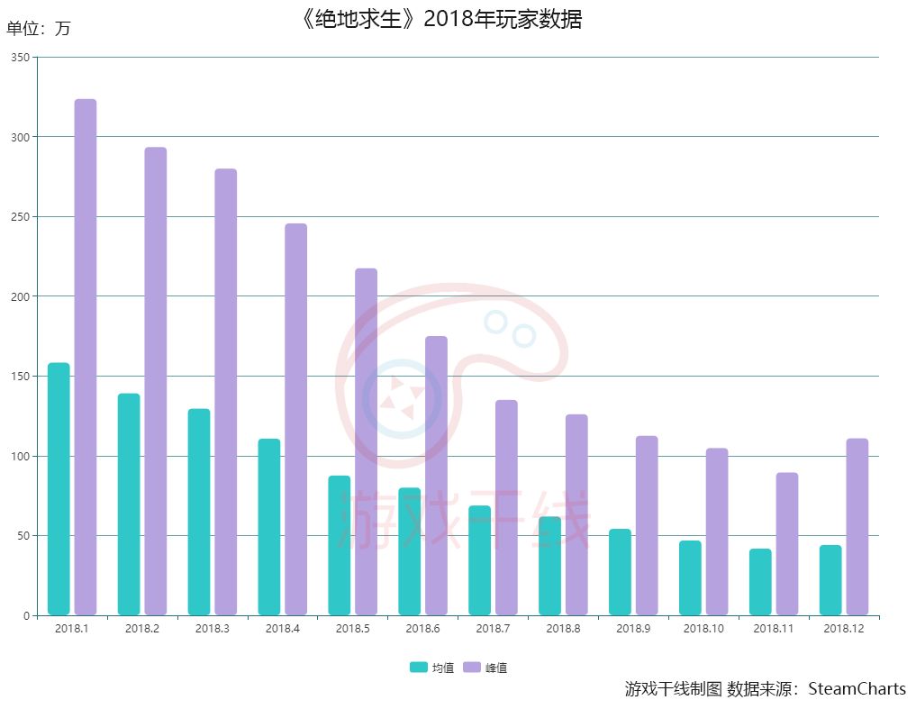 最新数据显示,在2018年11月份,《绝地求生》端游的峰值在线人数已经不足百万,平均在线人数也只剩下41.8万。对比2018年初323万的峰值在线人数和158万的平均在线人数,峰值在线人数减少了72%,平均在线人数减少了73%。