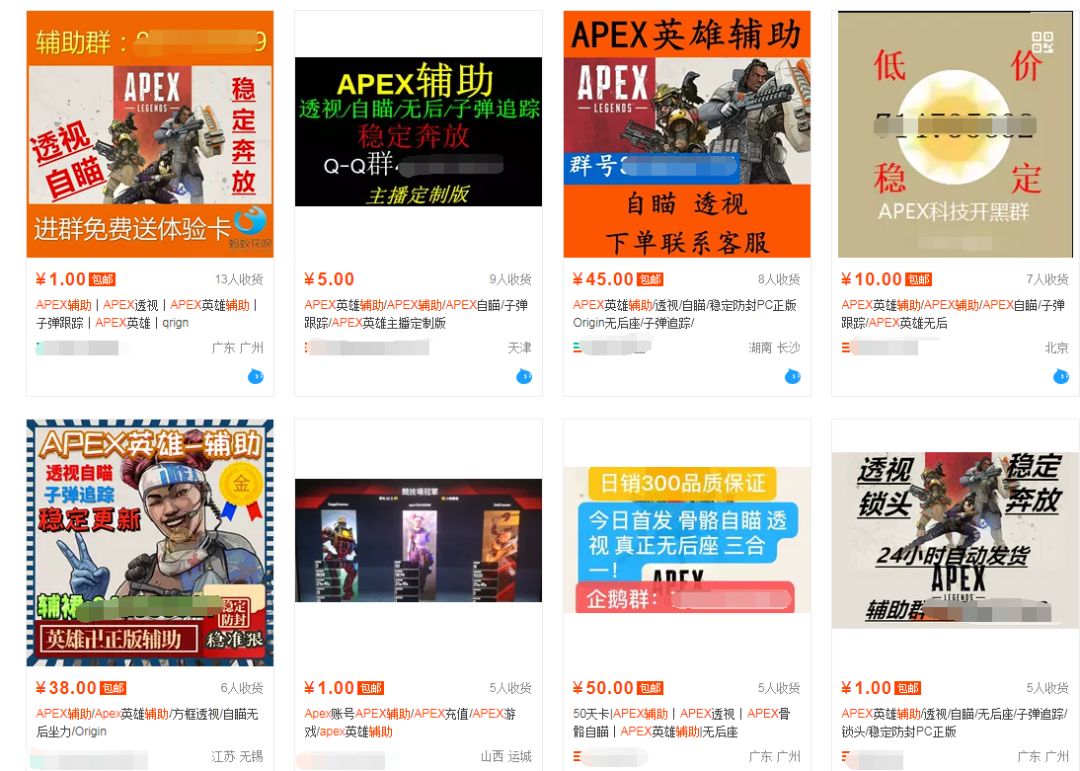 在淘宝搜索“APEX英雄 辅助”,会很轻松的搜到大量正在出售的游戏外挂产品,有些商家甚至抢先推出了“主播定制版”。