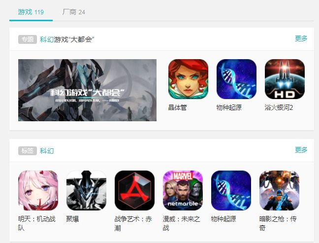在TAPTAP中搜索科幻游戏,显示了119个结果。相比起“武侠”(384)、“仙侠”(508)、“战争”(739)等题材,结果数量少了很多。